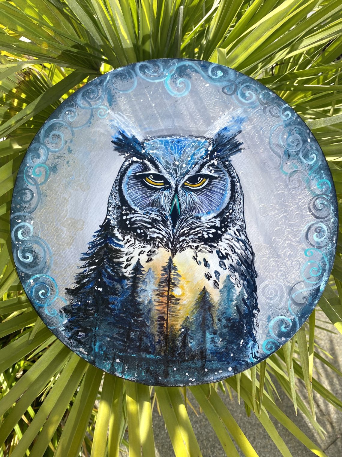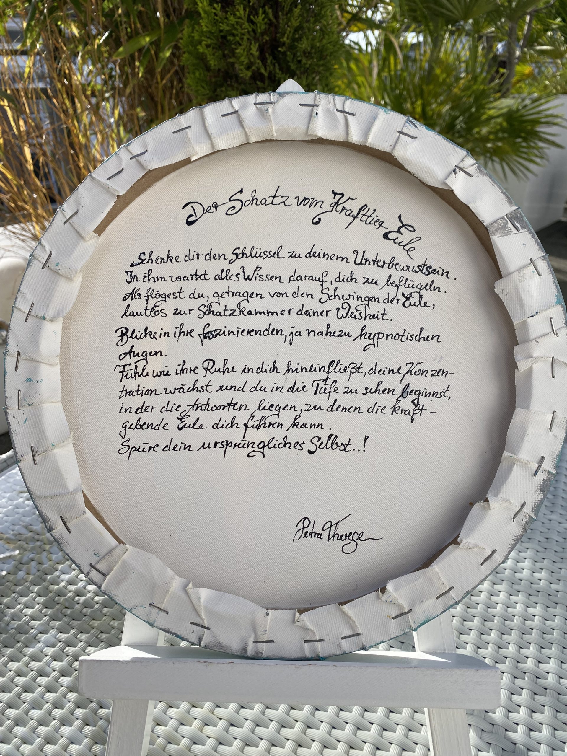 Schenke dir den Schlüssel zu deinem Unterbewusstsein. In ihm wartet alles Wissen darauf, dich zu beflügeln. Als flögest du, getragen von den Schwingen der Eule, lautlos zur Schatzkammer deiner Weisheit. Blicke in ihre faszinierenden, ja nahezu hypnotischen Augen. Fühle wie ihre Ruhe in dich hinein fließt, deine Konzentration wächst und du in die Tiefe zu sehen beginnst, in der die Antworten liegen, zu denen die kraftgebende Eule dich führen kann. Spüre dein ursprüngliches Selbst …! Text auf der Bildrückseite / Preis auf Anfrage /
