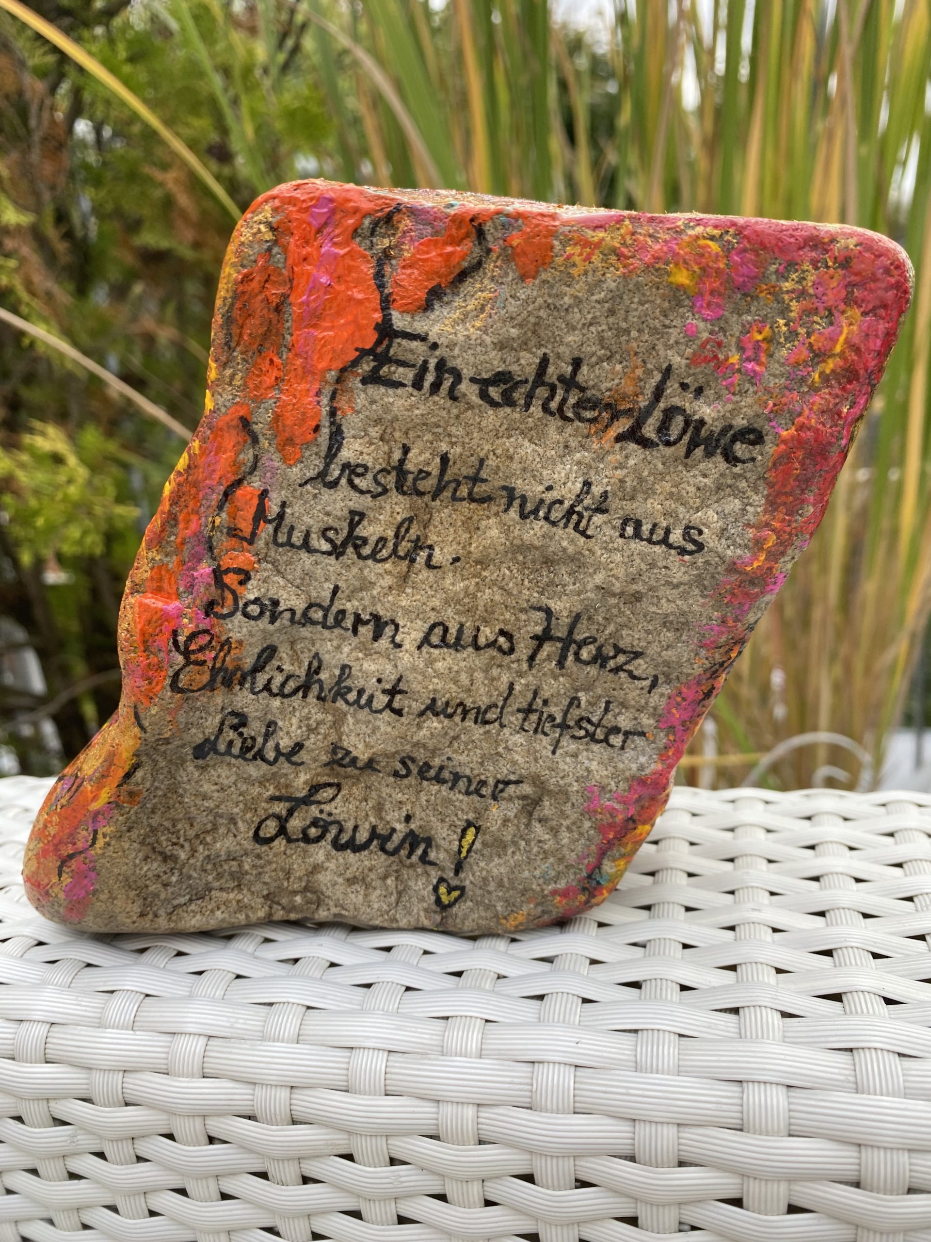 26. September 2025 Löwenpaar H. 13,5 x B. 12cm / Preis auf Anfrage/ Spruch Rückseite: Ein echter Löwe besteht nicht aus Muskeln. Sondern aus Herz, Ehrlichkeit und tiefster Liebe zu seiner Löwin! Post Info Author Info Petra Wegner 26. September 2025 Medialkunst (Startseite), Steinkunst, Steinkunst zu kaufen Vorheriger Beitrag „ Magic Cats „ Nächster Beitrag Sonnenblumenfest 2025 Petra Wegner Autor Beiträge von Petra Wegner Sonnenblumenfest 2025 29. September 2025 „ Magic Cats „ 23. September 2025 Eichhörnchen 23. September 2025 Eichhörnchenstamm 17. September 2025 Begegnung 17. September 2025 Kommentare von Petra Wegner Vorheriger Beitrag « Nächster Beitrag » Facebook Instagram Email Kategorien Ausstellungen Bilder Bilder Verkauft Bilder zu kaufen Blogbeiträge Entstehungen Medialkunst (Startseite) Steinkunst Steinkunst Verkaufte Steinkunst zu kaufen