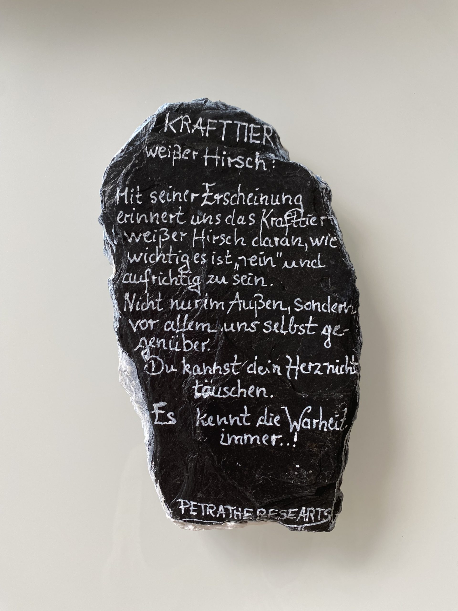 Text Rückseite: Krafttier weißer Hirsch: Mit seiner Erscheinung erinnert uns das Krafttier weißer Hirsch daran, wie wichtig es ist „ rein“ und aufrichtig zu sein. Nicht nur im Außen, sondern vor allem uns selbst gegenüber. Du kannst dein Herz nicht täuschen. Es kennt die Wahrheit immer …! H. 20 cm x 10 cm ( reserviert)